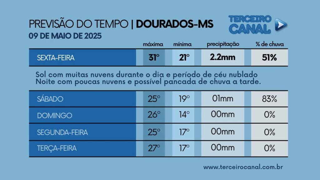 Esta sexta-feira (09), o dia começa com sol e tempo firme, devido a atuação de um sistema de alta pressão atmosférica, mas podem ter pancadas de chuva pontuais em diferentes regiões do Estado e em Dourados. Não estão descartadas tempestades, principalmente as regiões central e nordeste.