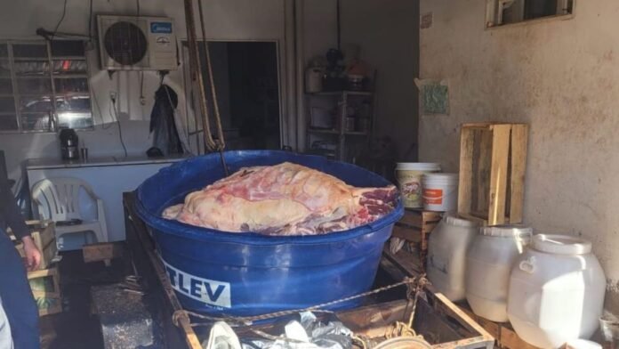 Após receber denúncia do setor de Repressão a Abates Clandestinos do IAGRO, a Polícia Civil deslocou uma equipe de policiais especializados na investigação de crimes contra as relações de consumo acompanhada por agentes do IAGRO e, desde a madrugada do dia 22, passaram a monitorar a fazenda de onde saia o gado clandestino abatido para venda a um açougue na cidade.