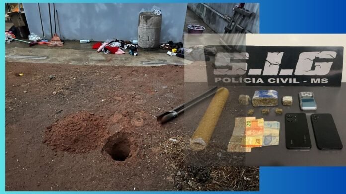 Durante revista pessoal e busca no imóvel, foram apreendidas seis porções de maconha (totalizando aproximadamente 230g), dois aparelhos celulares, uma balança de precisão, um rolo de plástico filme e R$ 72 em dinheiro. Também foi identificado que parte da droga havia sido recentemente desenterrada do quintal, o que indica tentativa de ocultação do material ilícito.