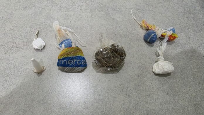Em sua posse foram encontrados dois invólucros de cocaína, um cigarro artesanal de maconha e uma porção da mesma droga escondida no calçado.