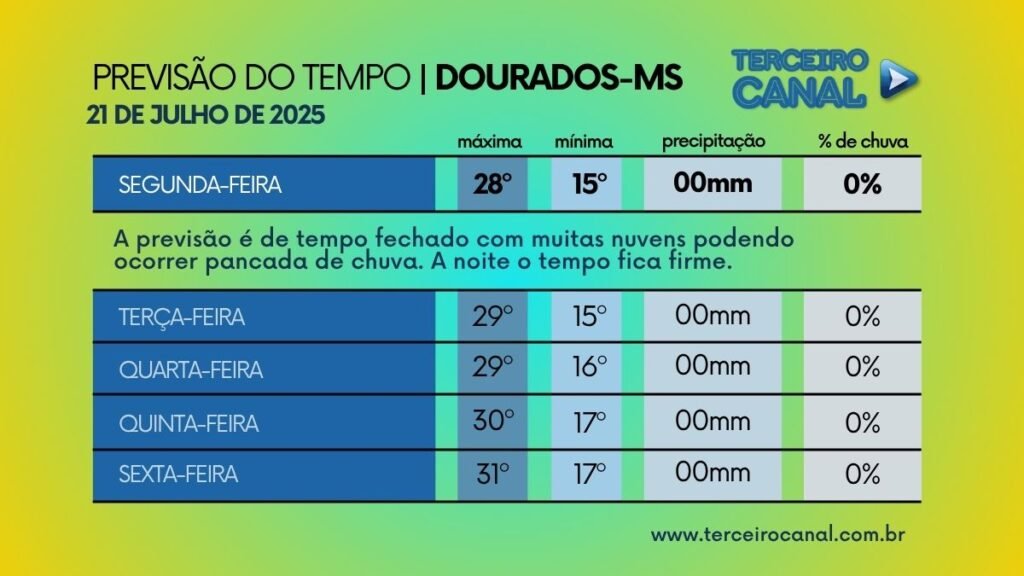 Previsão do tempo para esta segunda-feira 21/07 a sexta-feira 25/07 em Dourados e região
