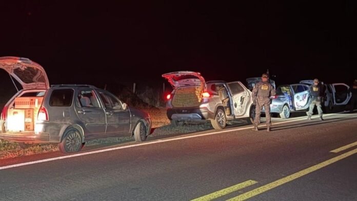 A inspeção nos veículos revelou que dois deles, um Renault Logan e um Fiat Pálio, transportavam os 350 pacotes de cigarros contrabandeados. Os outros dois automóveis, um Fiat Cronos, furtado em Porto Seguro (BA), e um GM Tracker, furtado em São Paulo (SP), estavam com 4.151 quilos de maconha.