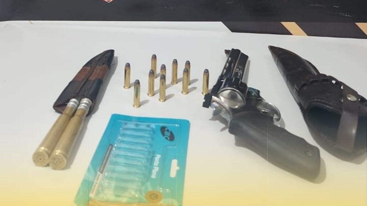 Durante a diligência, foram apreendidas uma arma de fogo, tipo revólver, calibre .357, dez munições intactas de mesmo calibre, uma faca e uma chaira, onde estavam estojos deflagrados de munição .50.
