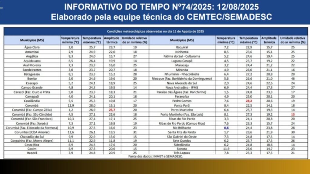 Devido a presença do ar seco são esperadas altas amplitudes térmicas, que é a diferença entre a temperatura máxima e a mínima, podendo superar os 20°C de variação no mesmo dia.