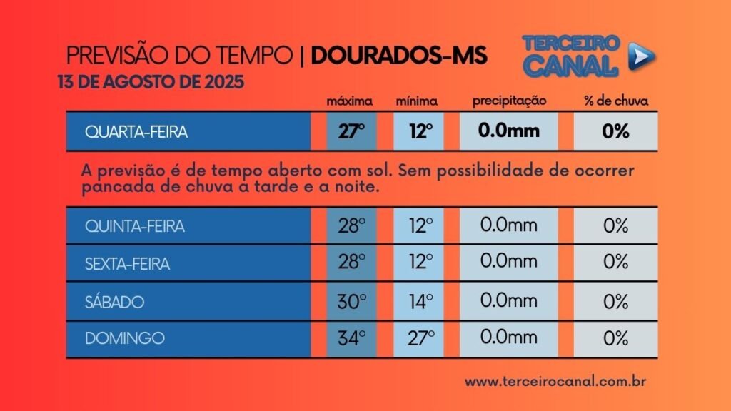 Previsão do tempo para esta quarta-feira 13/08 a domingo 17/08 em Dourados e região
