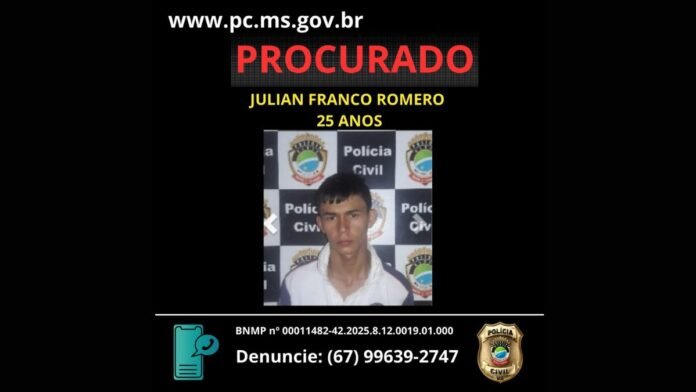Na ação, A.M.R., de 24 anos, foi preso em flagrante após o assalto cometido com uso de arma de fogo. Em diligências posteriores, a polícia identificou o comparsa que fugiu do local: Julian Franco Romero, 25 anos. Contra ele foi expedido mandado de prisão preventiva (BNMP nº 0001482-42.2025.8.12.0019.01.0001-21). Romero encontra-se foragido.