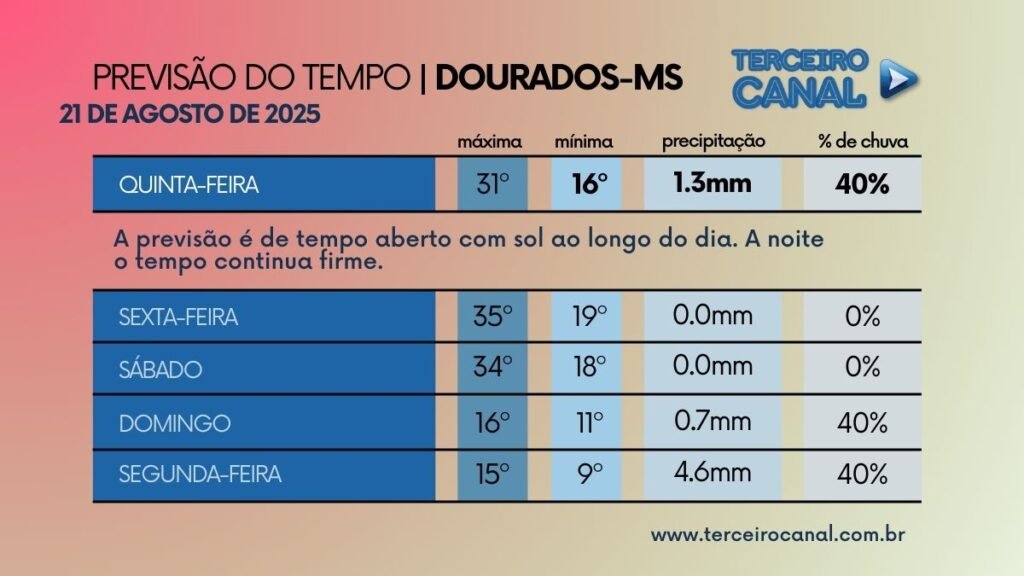 A quinta feira (21) em Mato Grosso do Sul com tempo firme e estável, com predomínio de sol e pouca nebulosidade. Essa condição meteorológica está associada à atuação de um sistema de alta pressão atmosférica, que inibe a formação de nuvens e a ocorrência de precipitações, em todas as regiões do Estado.