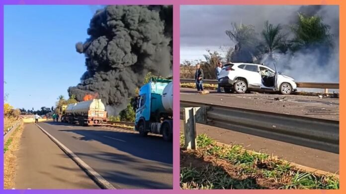 Segundo apurado, um veículo de passeio conduzido por uma familia, por motivos a serem apurados, perdeu o controle e invadiu a pista contrária. Uma carreta graneleira que vinha na direção oposta tentou desviar, mas ao retornar à faixa colidiu frontalmente com um caminhão-tanque que trafegava no sentido oposto.