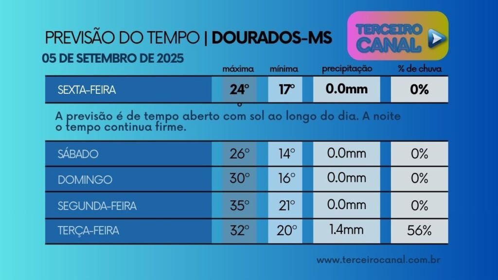 A previsão indica sol entre nuvens e possibilidade de pancadas de chuva isoladas para esta sexta. O destaque do dia é a queda brusca das temperaturas no sul: em Ponta Porã e Porto Murtinho, os termômetros não devem passar de 17°C, enquanto no norte, em municípios como Paranaíba e Coxim, a máxima pode chegar a 35°C.