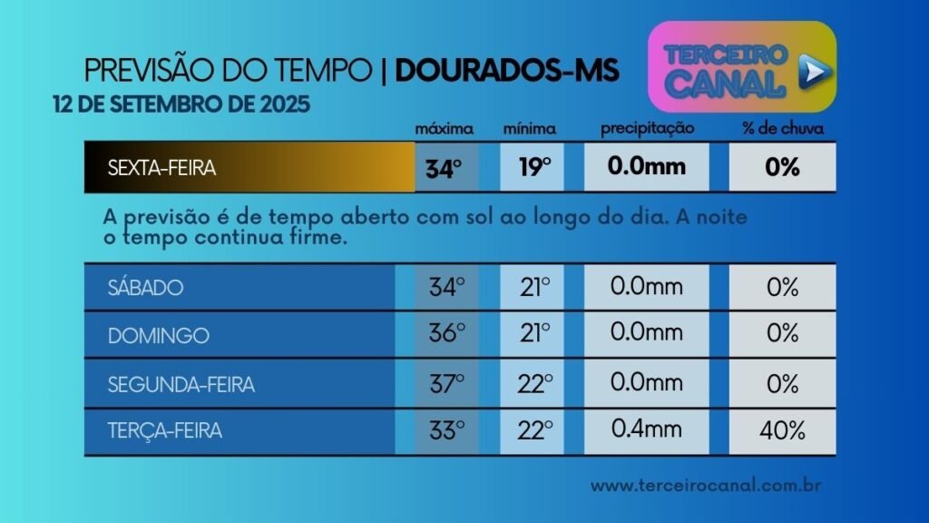 Previsão do tempo para esta sexta-feira 12/09 a terça-feira 16/09 em Dourados