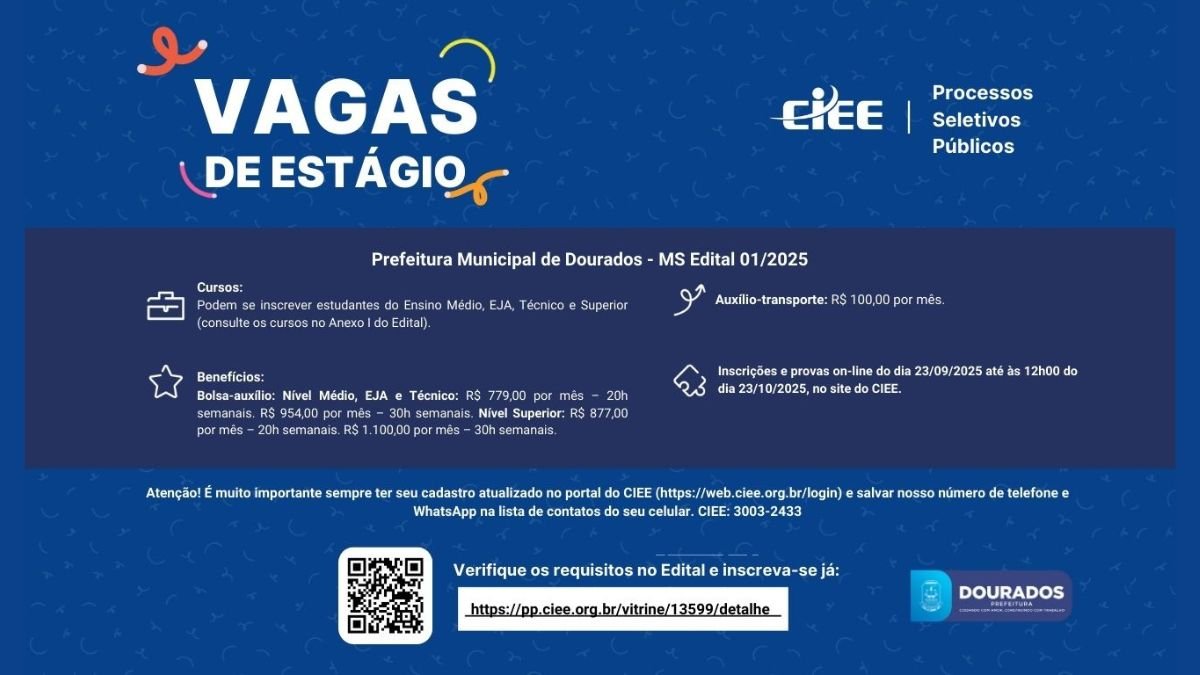 A Prefeitura de Dourados lançou o Edital nº 01/2025 para seleção de estagiários, em parceria com o Centro de Integração Empresa-Escola – CIEE. O processo oferece oportunidades para estudantes do Ensino Médio, Educação de Jovens e Adultos (EJA), cursos Técnicos e de Ensino Superior.
