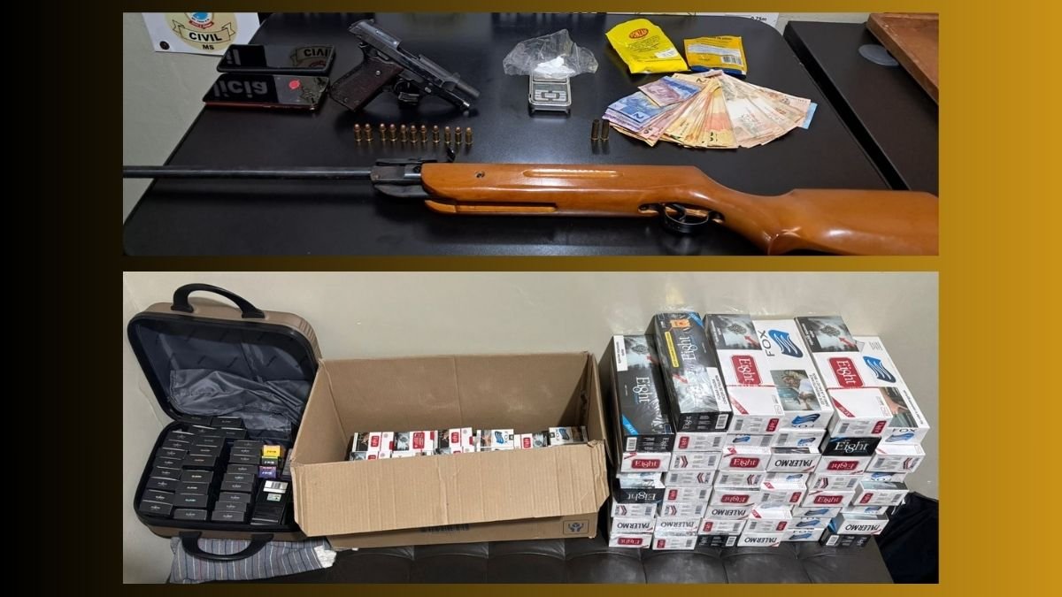A Polícia Civil, por meio da Delegacia de Itaporã, realizou nesta quinta-feira (25) uma operação para cumprimento de mandados de busca e apreensão em duas residências. Durante a ação foram apreendidos arma de fogo, munições, entorpecentes, cigarros eletrônicos e cigarros de origem estrangeira. Um dos investigados foi preso em flagrante.