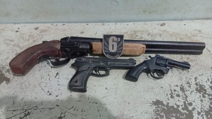 A vítima conduziu os policiais até o local onde estava guardada uma arma. No imóvel, os militares apreenderam uma arma de fabricação artesanal tipo garrucha calibre 12 e dois simulacros, sendo um em formato de pistola e outro de revólver.