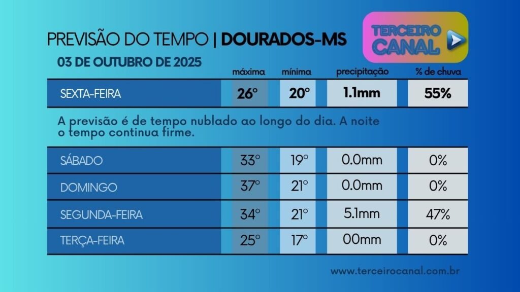 Previsão do tempo para esta sexta-feira 03/10 a terça-feira 07/10 em Dourados
