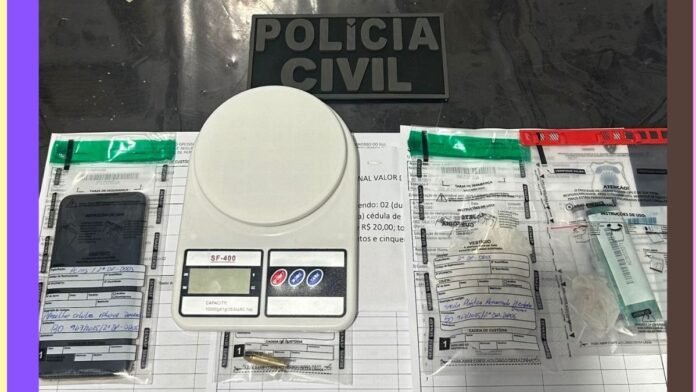 Durante o monitoramento, os policiais observaram intensa movimentação de pessoas e a chegada e saída do veículo, conduta típica de ponto de tráfico. No local, foram encontradas 12 pedras de crack escondidas próximo à janela lateral da casa, R$ 350,00 em espécie, uma balança de precisão, uma munição calibre .38, além de um aparelho celular bloqueado.