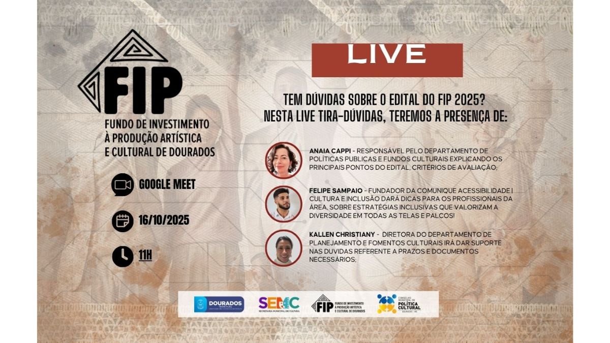 A Prefeitura de Dourados, por meio da Secretaria Municipal de Cultura, realiza nesta quinta-feira (16) uma live especial para esclarecer dúvidas sobre o edital do Fundo Municipal de Investimentos à Produção Artística e Cultural (FIP). O encontro on-line tem o objetivo de orientar artistas, produtores e agentes culturais sobre as etapas de inscrição, critérios de avaliação e documentação necessária para participar da seleção.