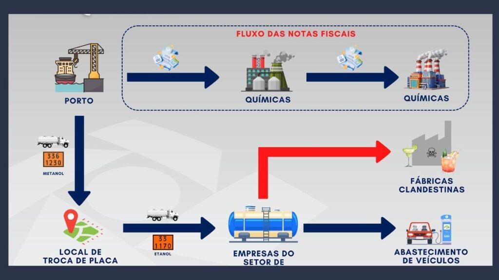 Já as destilarias investigadas teriam adquirido metanol por meio de empresas conhecidas como “noteiras”. As notas fiscais indicavam caminhões e motoristas que, contudo, nunca chegaram aos destinos informados, sugerindo possível fraude documental.