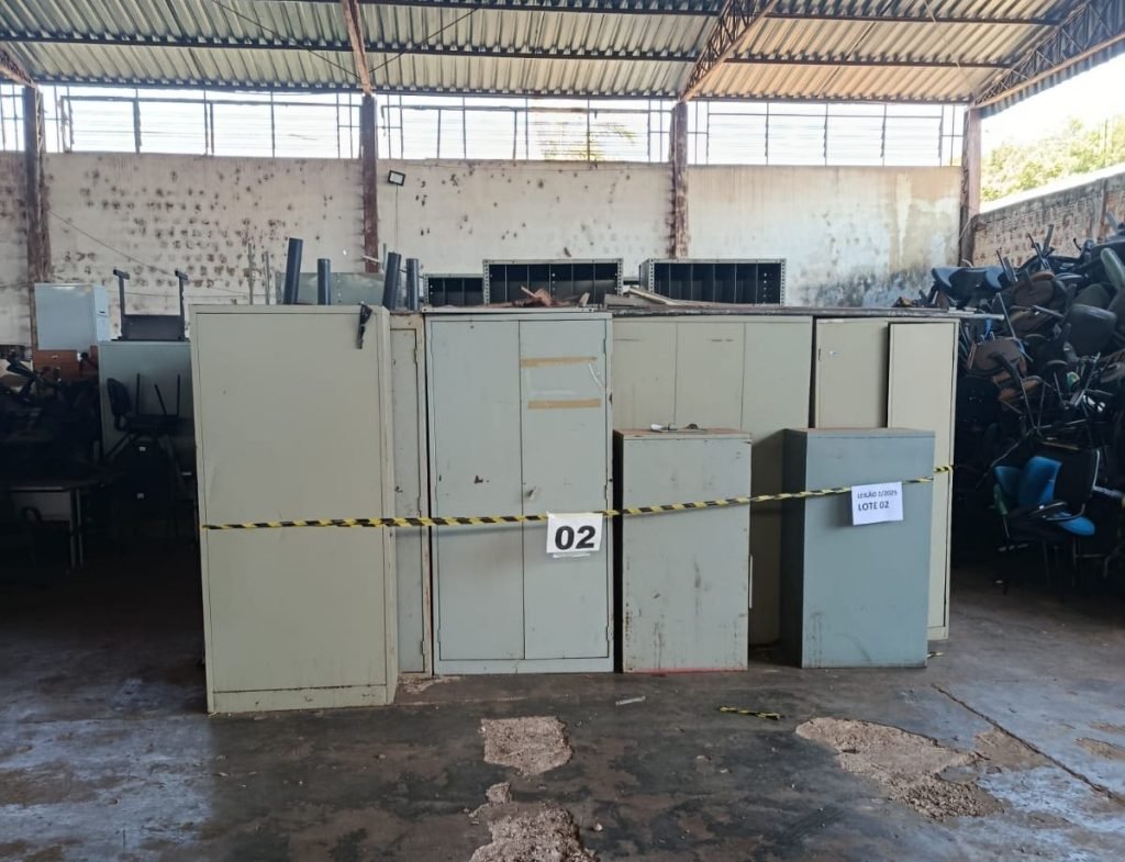 – Lote 2: arquivos e estantes de aço, armários e mesas de aço, além de sucatas.