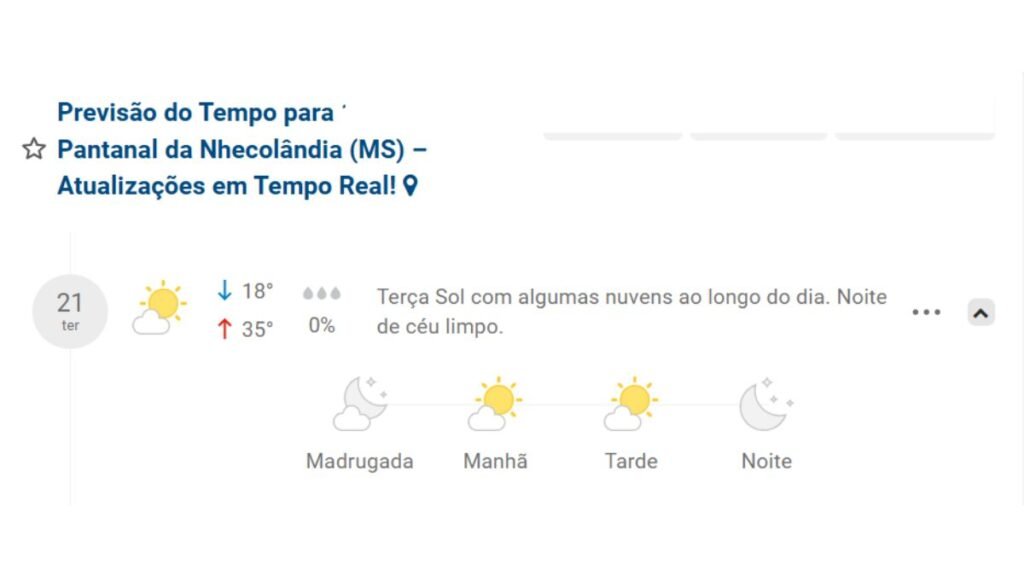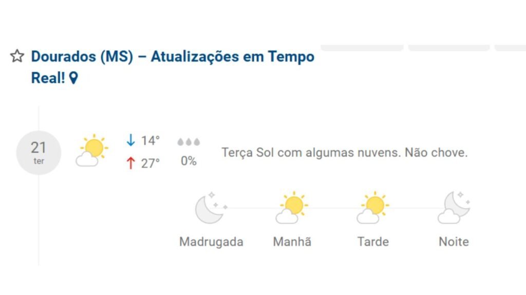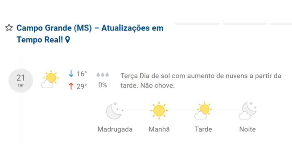 As regiões sul, cone-sul e Grande Dourados terão mínimas entre 14°C e 27°C a máximas entre. Já no sudoeste e Pantanal varia entre 18°C e até 35°C. Para o Bolsão, leste e norte tem mínimas entre 19°C e 26°C e máximas de 35°C a 38°C. Na Capital fica entre 16°C e 29°C.
