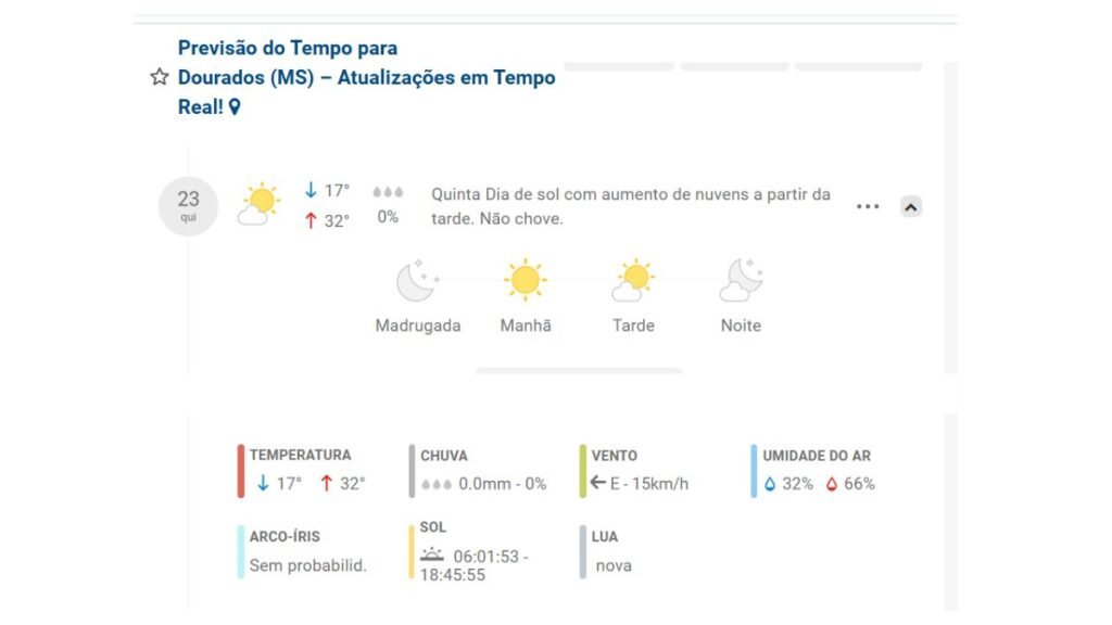 Previsão do tempo para esta quinta-feira 23/10 em Dourados