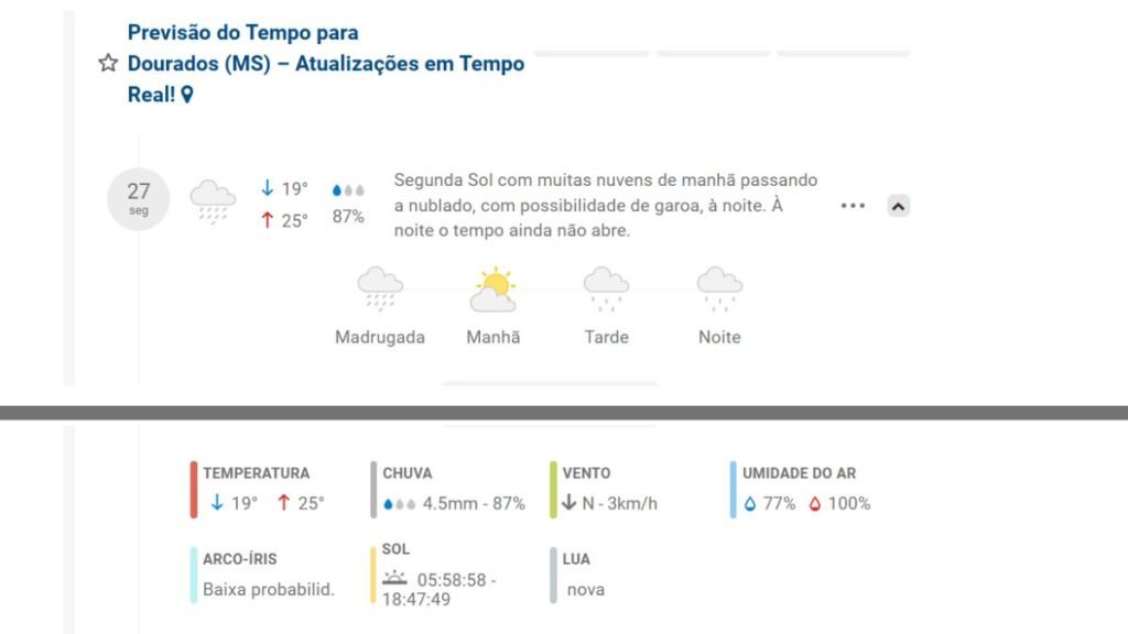 Previsão do tempo Hoje 27/10 Caarapó (MS) 19°C e maxima 25°C – Chuva1.6mm – 90%