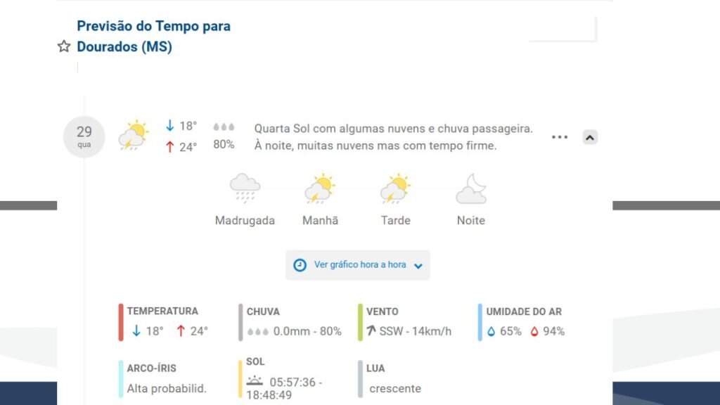 A previsão do tempo para Dourados, MS, na quarta-feira, 29 de outubro de 2025, indica dia de manhã nublado sem sol com algumas nuvens e chance de chuva passageira. À noite, o tempo fica mais firme, embora com muitas nuvens.