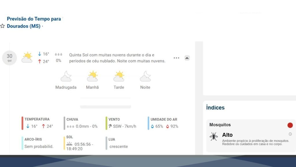 Previsão do tempo Hoje 30/10 Fátima do Sul (MS) 16°C e maxima 24°C – Chuva 0.0mm –00%