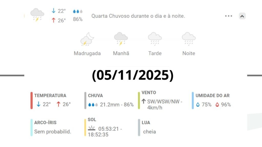 • Sábado (08/11): Chuva forte de manhã, com sol e diminuição de nuvens à tarde. Noite com muitas nuvens.