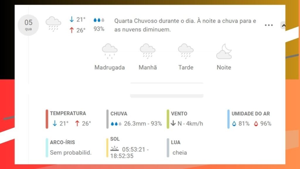 - Hoje (Quarta-feira): Chuvoso durante o dia e à noite. A temperatura máxima prevista é de 28°C e a mínima de 21°C. A umidade média será alta (81%).