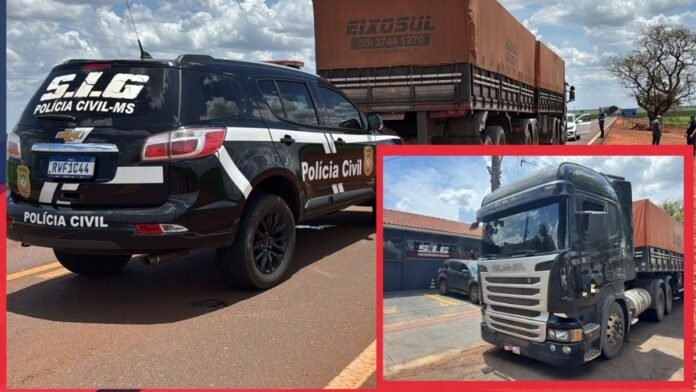 A Polícia Civil do Mato Grosso do Sul (PCMS), por meio da Seção de Investigações Gerais/Núcleo Regional de Inteligência (SIG/NRI) de Dourados, recuperou na tarde desta quarta-feira (12/11) uma carreta Scania roubada no Estado de São Paulo e que estava sendo levada para a fronteira com o Paraguai. O conjunto, avaliado em cerca de R$ 400 mil, havia sido subtraído no dia anterior, após o motorista da empresa ser rendido e mantido em cativeiro por criminosos durante cerca de 18 horas.