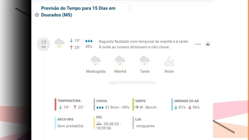 A previsão do tempo para Dourados (MS) indica chuva forte para hoje, segunda-feira (17 de novembro de 2025), com temperaturas amenas, e tempo ensolarado a partir de amanhã