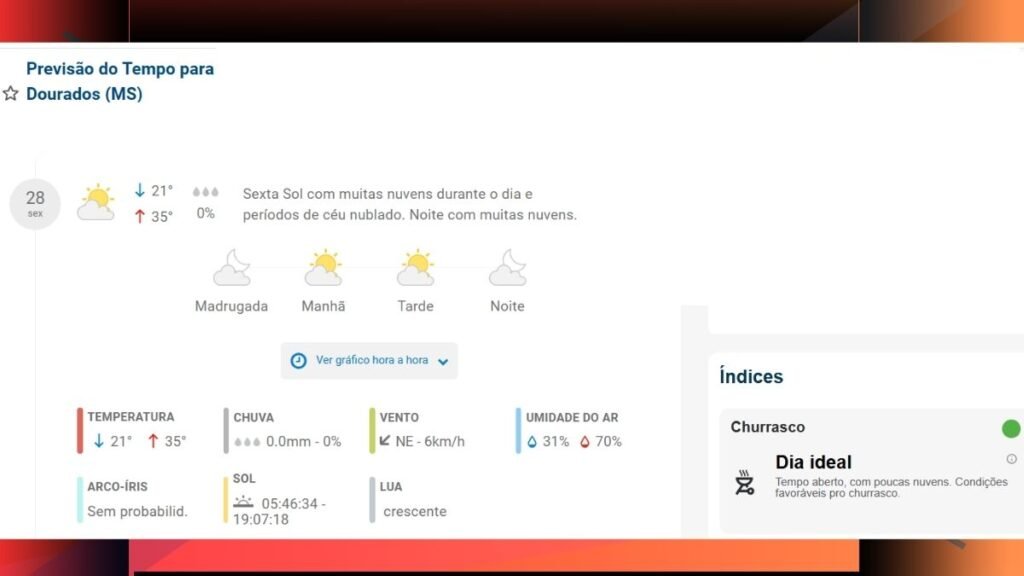 A previsão do tempo para Dourados, MS, hoje (sexta-feira, 28 de novembro de 2025) é de sol com muitas nuvens durante o dia e períodos de céu nublado, sem chuva. A temperatura máxima prevista é de 35°C e a mínima de 22°C.