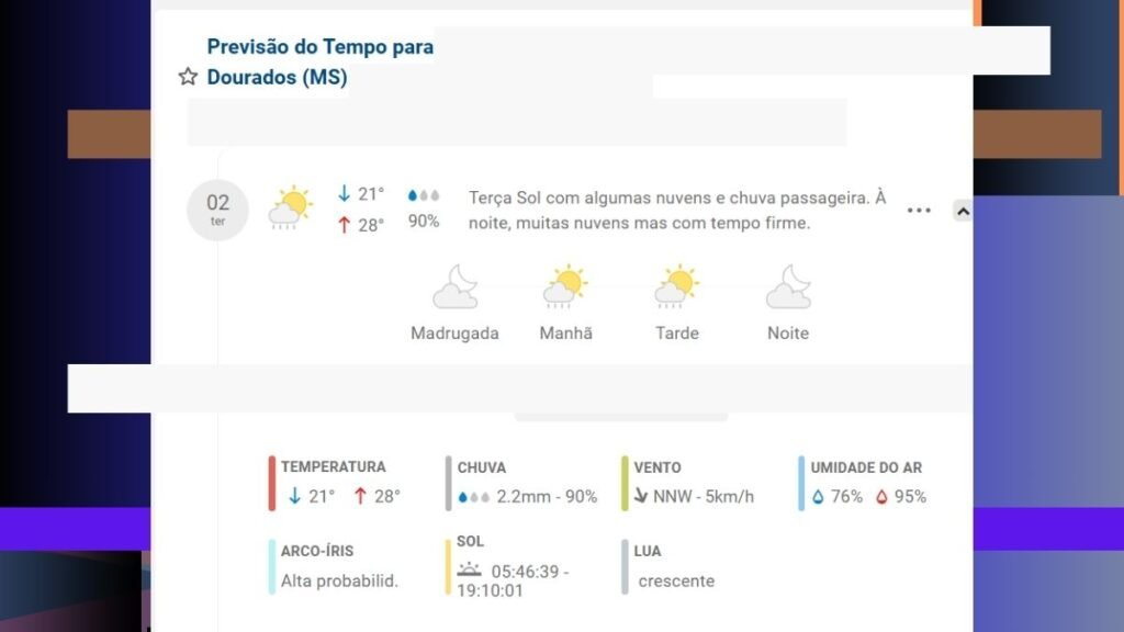 O Climatempo prevê um dia de sol com algumas nuvens e chuva passageira para Dourados, MS, nesta terça-feira (2 de dezembro de 2025). A temperatura máxima pode chegar a 21°C, com mínima de 28°C.