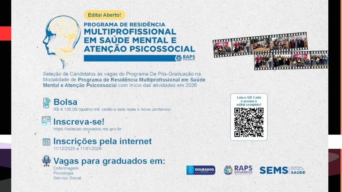 São três vagas em cada área de graduação, entre ampla concorrência e de política afirmativa. As bolsas disponibilizadas serão no valor de R$ 4.106,09. As inscrições devem ser realizadas exclusivamente pela internet, no endereço https://selecao.dourados.ms.gov.br no ícone Programa de Residência Multiprofissional em Saúde Mental e Atenção Psicossocial com o preenchimento da ficha pelo candidato e inclusão dos arquivos anexos conforme descritos no edital. Para acessar o edital na íntegra –clique aqui : https://do.dourados.ms.gov.br/index.php/edicao-6-526-quinta-feira-11-12-2025/.