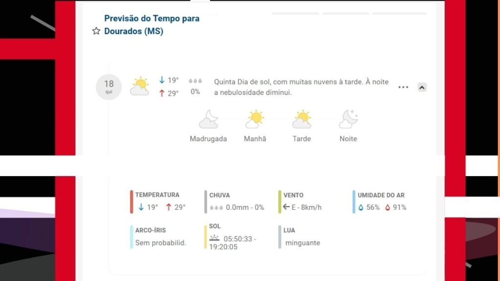 A previsão do tempo para Dourados – MS nesta quinta-feira, 18 de dezembro de 2025, indica um dia ensolarado com aumento de nuvens.