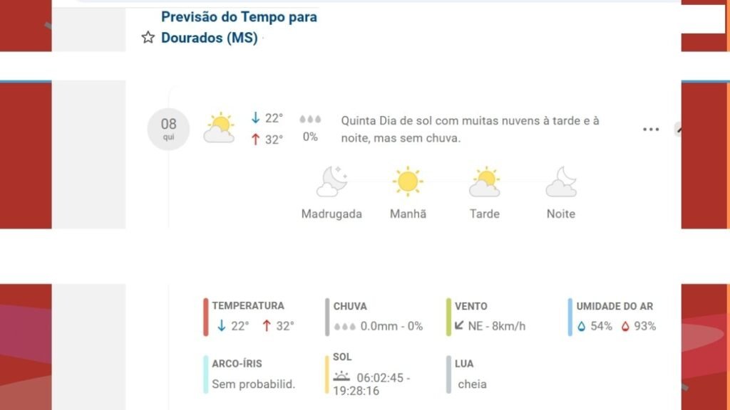 Previsão do tempo Hoje 08/01 Naviraí (MS) 22°C e maxima 32°C – Chuva 0.0mm – 0%