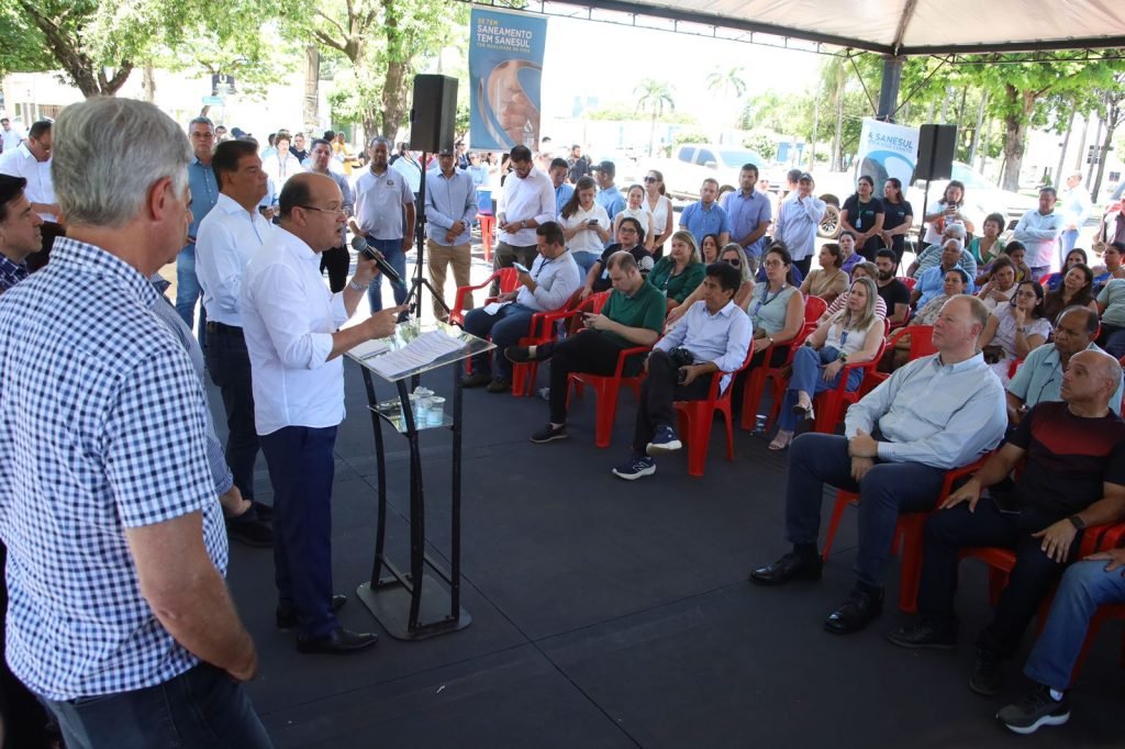 O prefeito de Naviraí, Rodrigo Massuo Sacuno, e representantes da Sanesul estiveram presentes na solenidade.