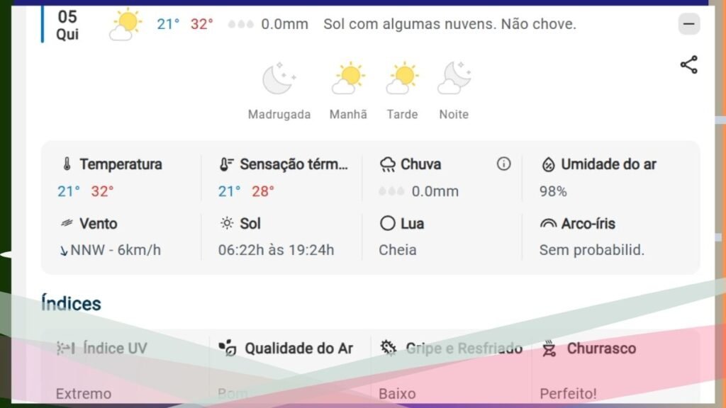 - Amanhã (06/02): O calor continua, com máxima chegando aos 33°C. O dia deve ser ensolarado, com muitas nuvens à tarde e redução da nebulosidade à noite.