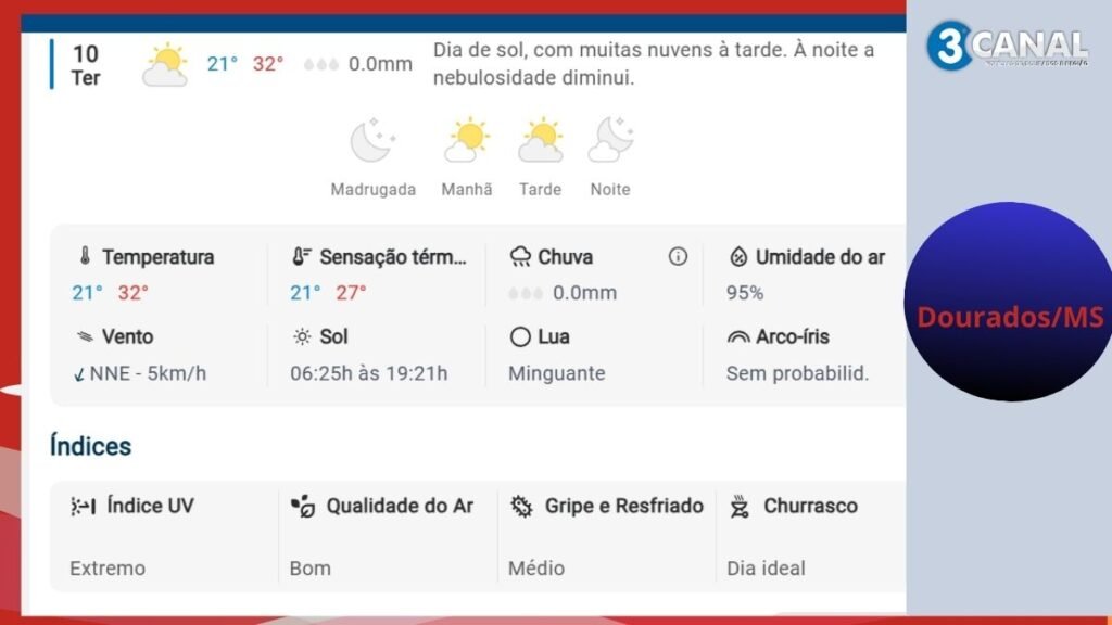 Previsão do tempo Hoje 10/02 Fátima do Sul (MS) 21°C e maxima 31C – Chuva 0.0mm – 0%