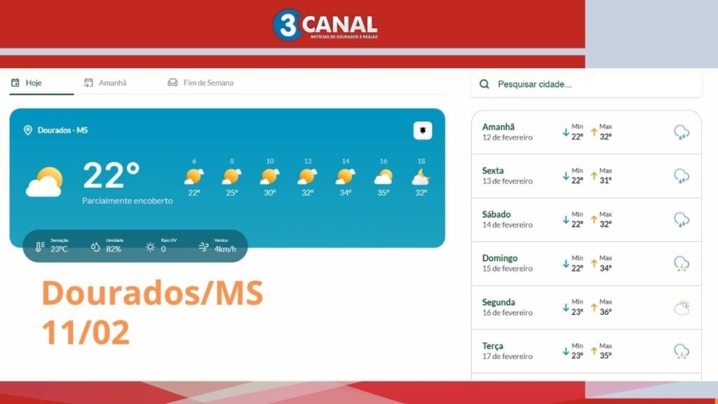 Para hoje, 11 de fevereiro, a previsão em Dourados, MS indica um dia de sol com muitas nuvens, mas sem chuva significativa durante o dia.