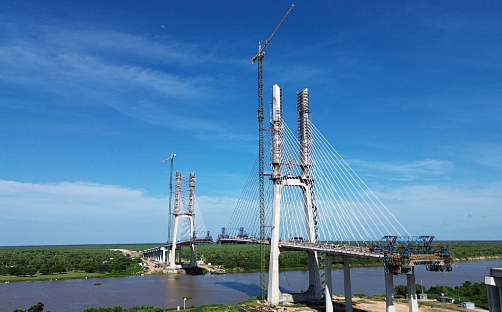 A Ponte Internacional da Rota Bioceânica, que ligará Porto Murtinho (MS) a Carmelo Peralta (Paraguai), avançou para a etapa final de ligação entre os dois países. A estrutura estaiada tem 1.294 metros de extensão e 21 metros de largura; faltam cerca de 101 metros para o fechamento total.