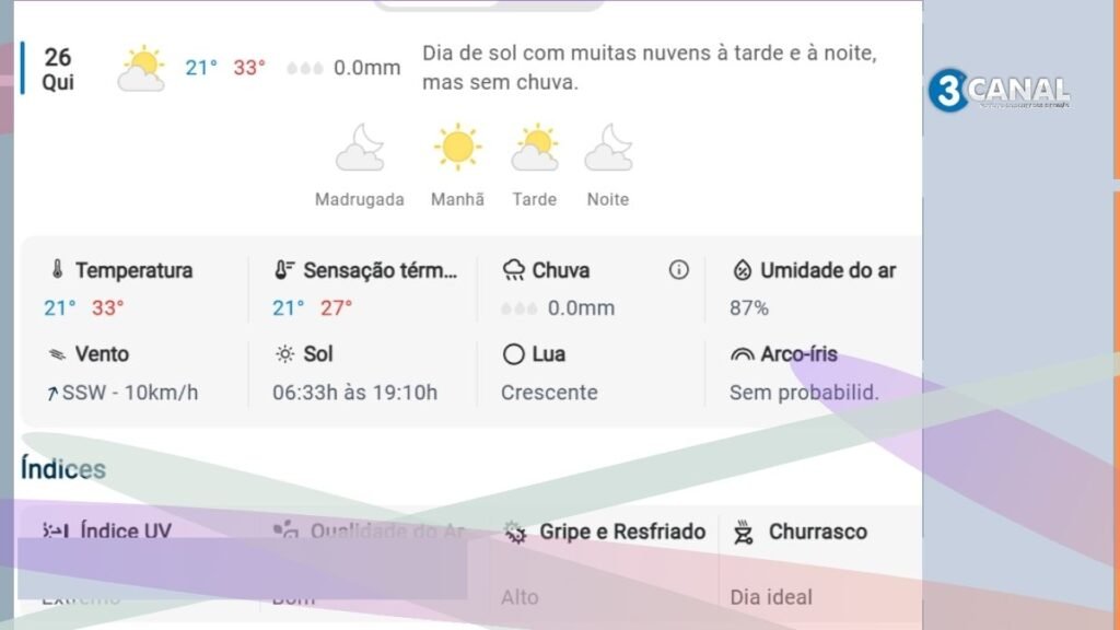 - Condições: Predomínio de sol, com possibilidade de muitas nuvens ao longo do dia.