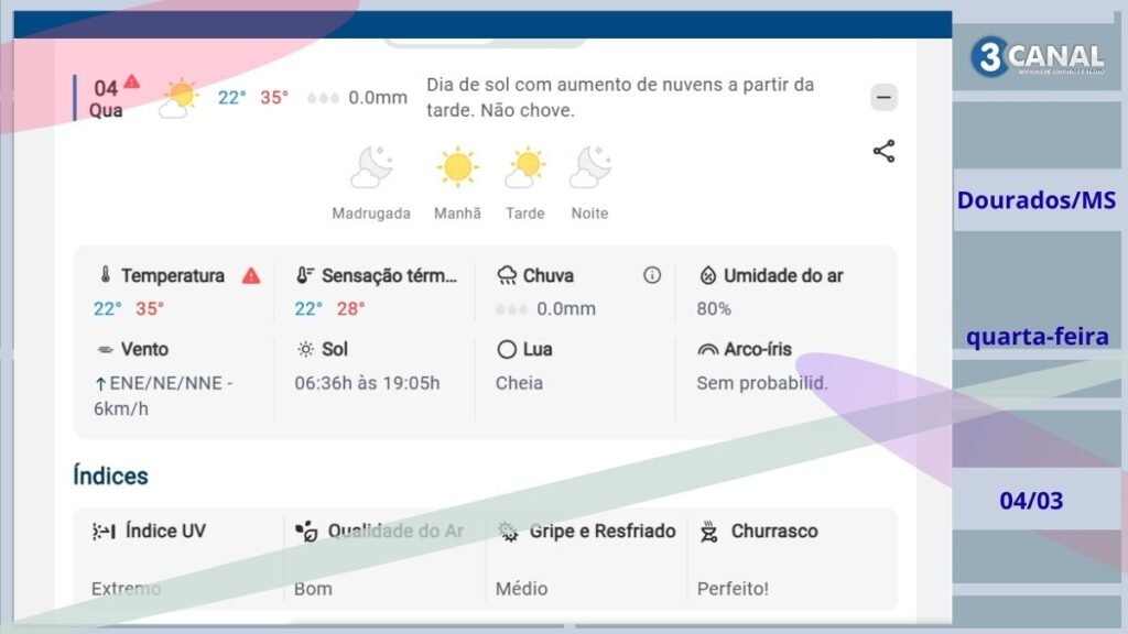 Previsão do tempo Hoje 04/03 Amambai (MS) 22°C e maxima 35C –Chuva 0.0mm – 0%