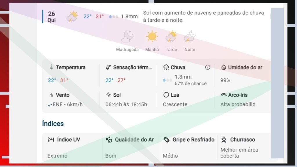 • Índice UV: Muito alto; recomenda-se proteção solar e evitar exposição direta nos horários de pico.
