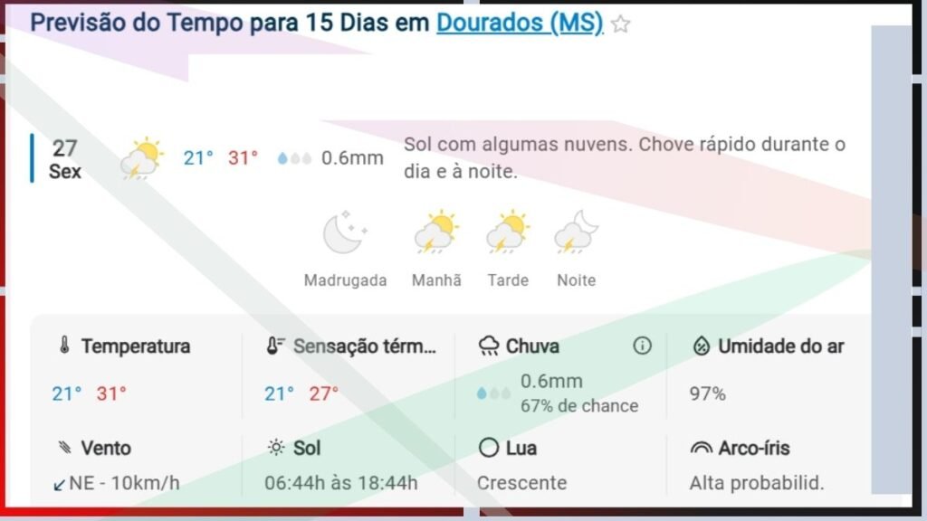 - Hoje (27/03): O dia começa com sol e algumas nuvens. Há previsão de chuva rápida durante o dia e à noite, com alta probabilidade de formação de arco-íris.