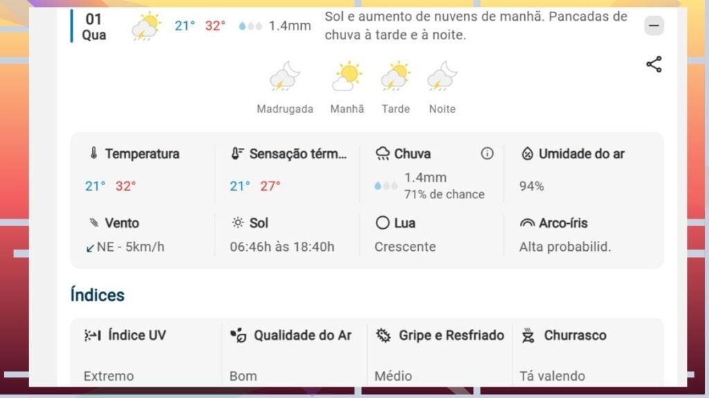 - Chuva: Há previsão e possibilidade de pancadas de chuva isoladas distribuídas entre os períodos da tarde e da noite.