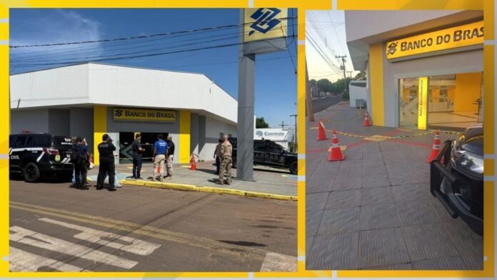 Por volta das 2h55, o COPOM acionou a Polícia Militar após o disparo do alarme de intrusão da agência. No local, foi verificada a violação do forro de gesso na área de autoatendimento, com indícios de acesso pelo telhado e marcas de escalada na parte externa do prédio.