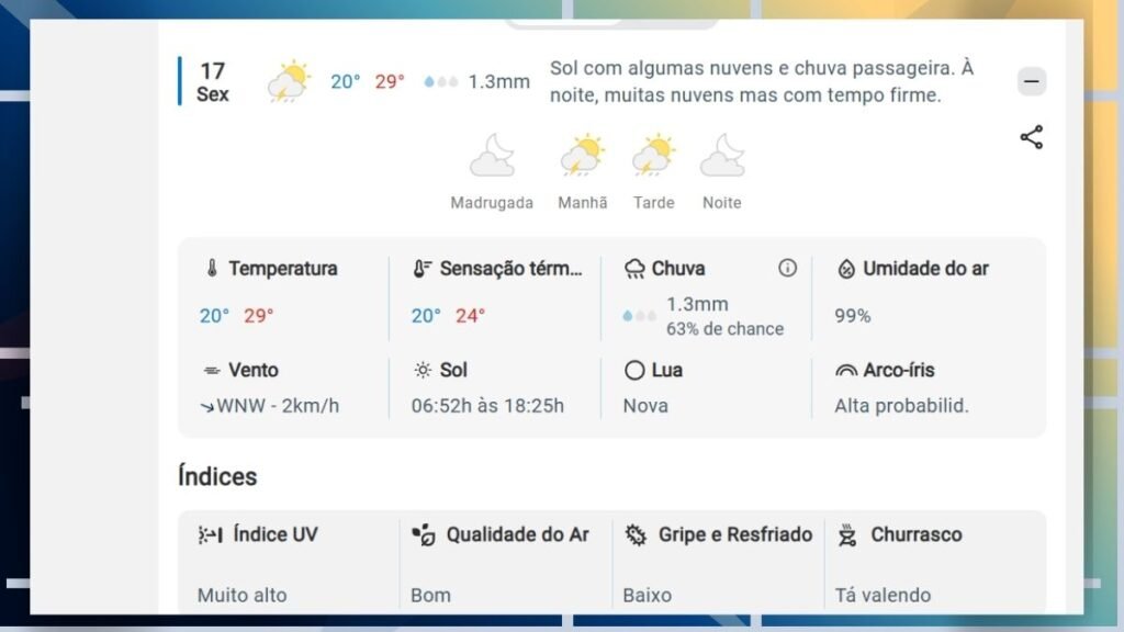 - Umidade: A umidade do ar pode variar entre 72% e 99% no fim de semana.