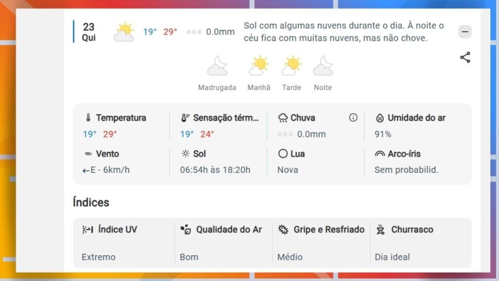 - Condições: O dia deve ser de sol com algumas nuvens, sem expectativa de chuva significativa durante a maior parte do dia.