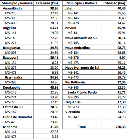 No Bolsão, a estratégia será adotada por meio de PPPs, com contratos mais longos, de 30 anos. A área de intervenção engloba municípios como Água Clara, Inocência, Paranaíba e Três Lagoas. Na região, a empresa responsável deverá manter em condições adequadas de tráfego e segurança as rodovias MS-377 (trecho entre Água Clara e Inocência) e MS-240 (trecho entre Inocência e Paranaíba), totalizando 208,7 km — 128,14 km na MS-377 (entre a BR-158 e a MS-112) e 80,56 km na MS-240 (entre a BR-262 e a MS-112).